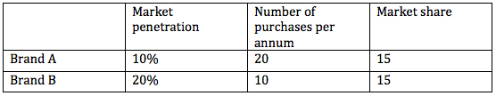 3. Market penetration into the repertoire is critical to brand growth. Sharp notes that while it is theoretically possible for a smaller brand to have more regular customers than a bigger brand, giving them an equal market share as illustrated in the table below, it never happens in the real world. Loyalty doesn’t vary much, but what little variation there is goes to the bigger brand. His Double Jeopardy law states that brands with less market share have less buyers who are slightly less loyal.